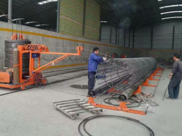2、鋼筋籠12米以上,或者單節鋼筋籠較重時,骨架中間加焊1、2圈纏繞筋替代第三個過渡箍?;蛑苯又虚g開始繞筋,另半截籠前面向中間纏繞連接完成。所以三個過渡箍的中間一個箍應置放在中間靠后面的地方,借以減少沖擊振動。退出輥輪并過渡到后面輥輪的方法--將過渡箍向后面推壓,讓過渡箍順膠輥旋轉到上面直到全部退出。準備臺架;若采用骨架直接滾進輥輪內檔(小型鋼筋籠),骨架制作臺架高度與設備同高。